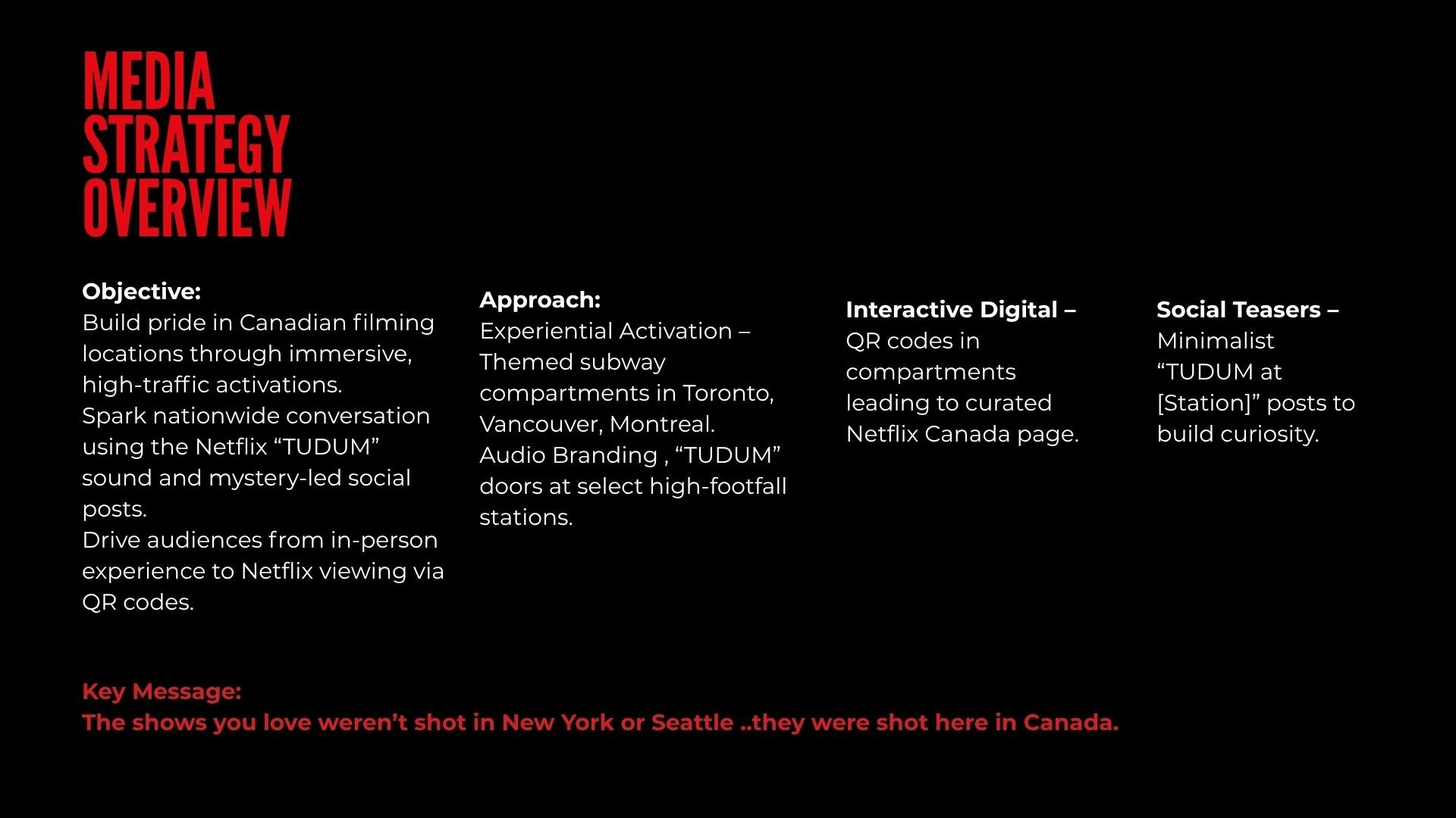 Digital Integration: QR codes placed in the transformed subway compartments led to a curated Netflix Canada page featuring Canadian-filmed shows, driving traffic to the service.