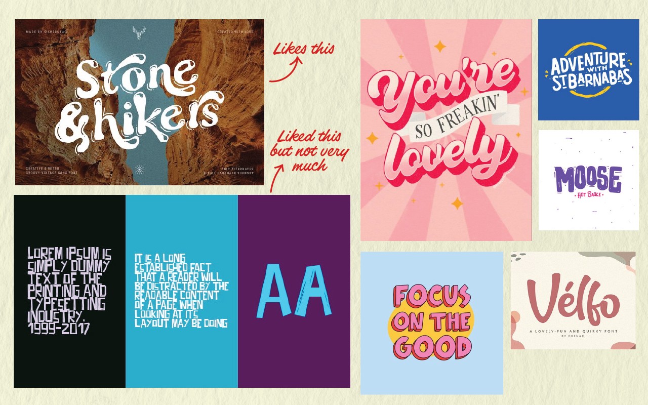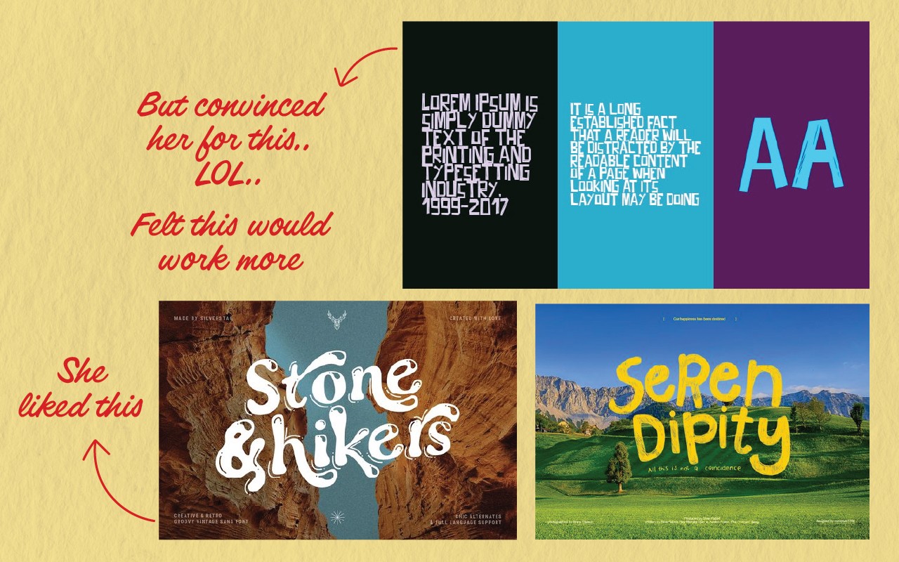 The process involved rough sketches and testing various font styles, ultimately moving away from some of her initial preferences (like "Serendipity") to a more impactful choice. Final production used Freepik assets for textures and various online sources for inspiration.