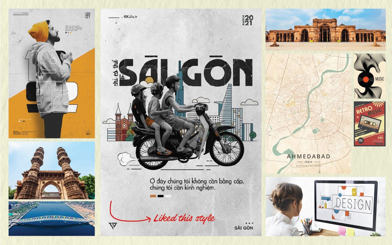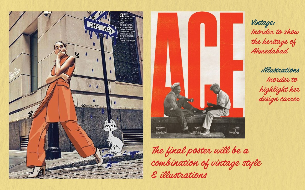 The core concept aimed to blend the vintage architecture and colors of Ahmedabad with her creative design career. This materialized in a final poster design combining a vintage style to show heritage and illustrations to emphasize her profession.