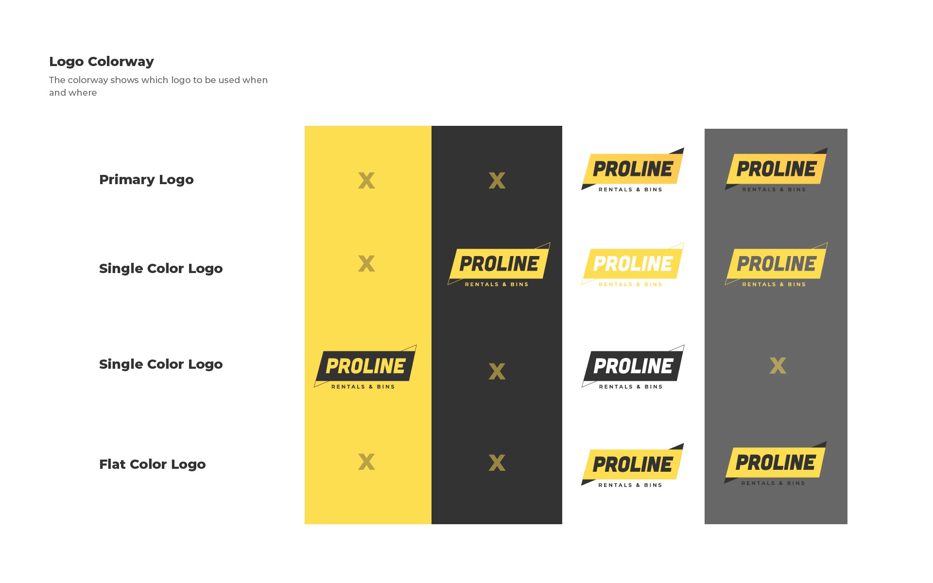 Created a comprehensive Brand Guideline for Proline Rentals & Bins, a local equipment rental and bin service. The project focused on defining a consistent, recognizable identity that honors its deep roots as a second-generation family-owned business while supporting its recent expansion. The guideline ensures all communications effectively highlight the brand's commitment to local service and operational strength.